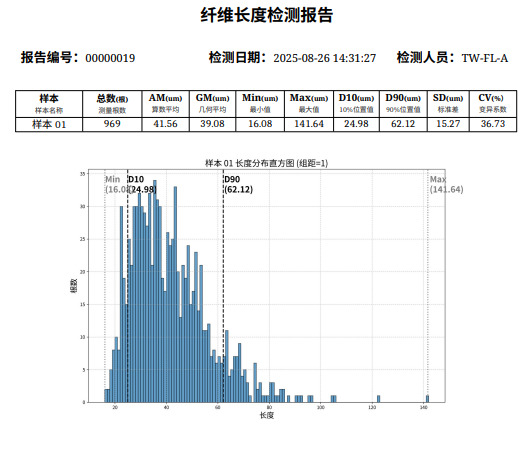 - 多维指标:9 大核心指标(总数、均值、极值、D10/D90、离散系数等),全维度解析纤维长度特性。